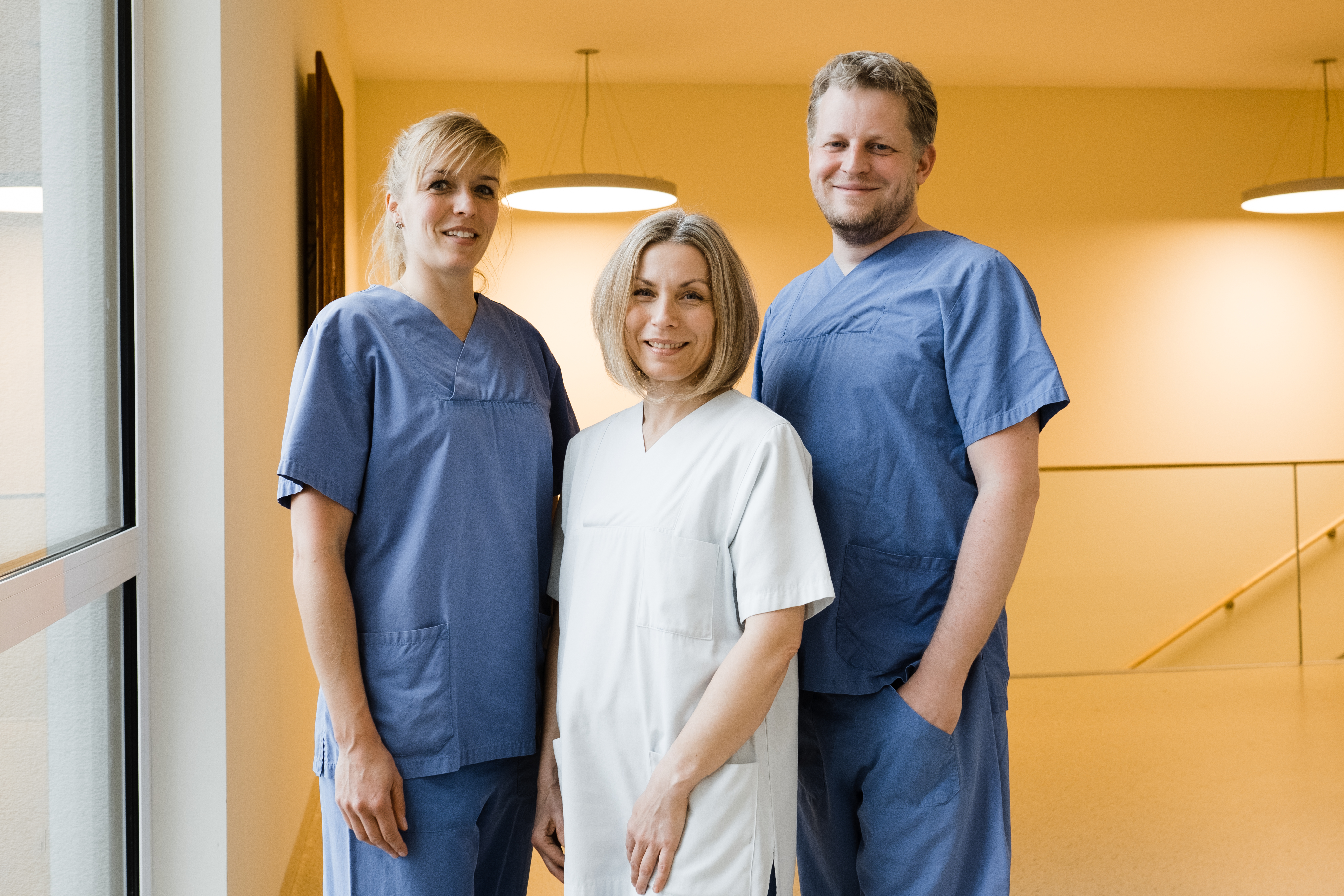 asklepios -Jennifer Liffers (links) Fachliche Leitung der IMC freut sich dass Andrea Niphut das Team verstärkt. Christopher Reimers bringt dank der Kollegen im Herzkatheterlabor seit Kurzem Familie und Beruf und einen Hut.