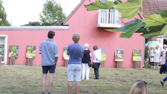 Es herrschte so eine gewisse „Laissez Faire“-Stimmung. Kunstgenuss unter strahlend blauem Himmel an diesem sonntäglichen Spätsommertag, hitzebedingt etwas Müßiggang, Sekt schlürfen im Schatten unter Apfelbäumen und Platanen, deren Blattwerk kein Windhauch bewegte, Kunstgespräche oder einfach nur genießen: Thilo Paccenini hatte auf dem Grundstück hinter dem Anwesen am Osterfelddeich den Nachlass von Christian Meier ausgestellt – genauer, eine Auswahl der Plain Air-Malerei, deren Verfechter er war, liebte es doch „Krischi“, wie ihn alle nannten, die Licht- und Schatteneffekte bis in die späten Abendstunden mit genauem Auge zu beobachten, mit Pinsel und Farbe, an der nicht sparte, einzufangen. Die Bilder in zumeist ausgeprägten Farbtönen (man könnte auch laienft knallbunt sagen, gleichwohl nicht übercandidelt) hatte Thilo Piccenini geschmackvoll in der Landschaft des Gartens platziert, in dem Sitzgruppen ihren Platz gefunden hatten, von wo aus man die Bilder im Panorama-Blick im Blick hatte – ob sie nun an der Hauswand, auf Apfelkisten stehend – lehnten, an der Schuppenwand hingen oder einem Baumstamm zur Zierde gereichten. Der Effekt: Sie Es entstand jeweils ein Bild im (mit) Bild mit eben jenen Licht- und Schatteneffekten, wie sie sich Christian Meier nicht hätte besser vorstellen können – und die „Laissez Faire“-Besucher goutierten es.