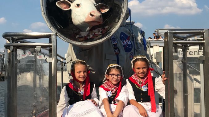 Am 15. August staunten die Menschen nicht schlecht, als das lebensgroße Maskottchen des Planetariums Hamburg am Finkenwerder Anleger Halt machte (Foto). Die Weltraumkuh Stella verweilt diesen Sommer in Hamburg und erkundet ihre Heimatstadt. Auf Finkenwerder angekommen, wurde Stella von der Finkwarder Speeldeel und Rolf Zuckowski in Empfang genommen – mit reichlich Abstand und ein bisschen Gesang in den Wind. Unter dem Motto #StellaAufTour ist die Entdecker-Kuh in der Hansestadt unterwegs. Da durfte auch eine kleine Hafenrundfahrt mit Barkassen-Meyer nach Finkenwerder nicht fehlen. Die Speeldeeler freuten sich über diesen ersten kleinen Auftritt seit den coronabedingten Auflagen vom März.