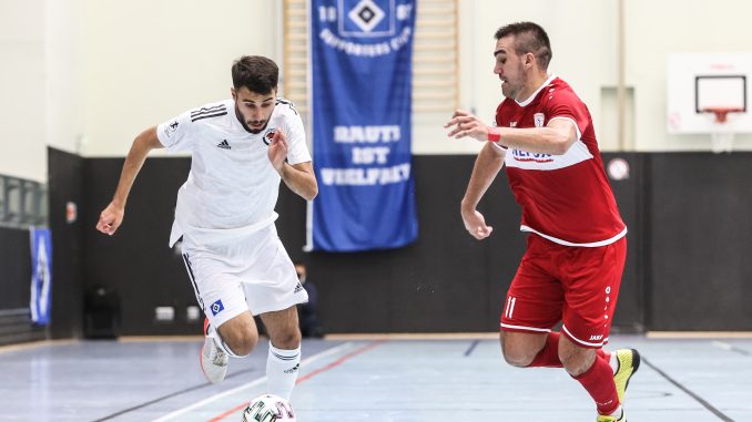 Beim Futsal unter dem Neugrabener Hallendach der CU-Arena sind spektakuläre Tricks an der Tagesordnung und in den Playoffs geht es für die HSV-Panthers in die heiße Saisonphase: Im Rahmen des Viertelfinales der Bundesliga-Playoffs empfangen die HSV-Futsaler am 23. April (18 Uhr) den MCH Futsal-Club aus Bielefeld. Es handelt sich bei der Partie um das Rückspiel, denn zunächst steigt das Hinspiel am 16. April in Bielefeld-Sennestadt, ehe es in Hamburg um den Einzug in die nächste Runde geht. Für das Playoff-Spiel in der heimischen CU-Arena in Hamburg-Neugraben gibt es keine G-Einschränkungen für Zuschauende. Lediglich eine FFP2-Maske muss verpflichtend im gesamten Hallenbereich sowie auf dem eigenen Sitzplatz getragen werden. Die Tickets kosten 8 Euro für Vollzahler (zzgl. Gebühren i.H.v. 0,60 Euro) sowie 5 Euro für Ermäßigte (zzgl. Gebühren i.H.v. 0,40 Euro), Kinder und Jugendliche bis 16 Jahre sind frei. Ab sechs Personen gibt es die Möglichkeit, ein Gruppenticket (5,40 Euro pro Person) zu erwerben. Alle weiteren Infos zu den Spielen und Tickets der HSV-Panthers gibt es unter www.hsv-ev.de. Foto: Torsten Helmke