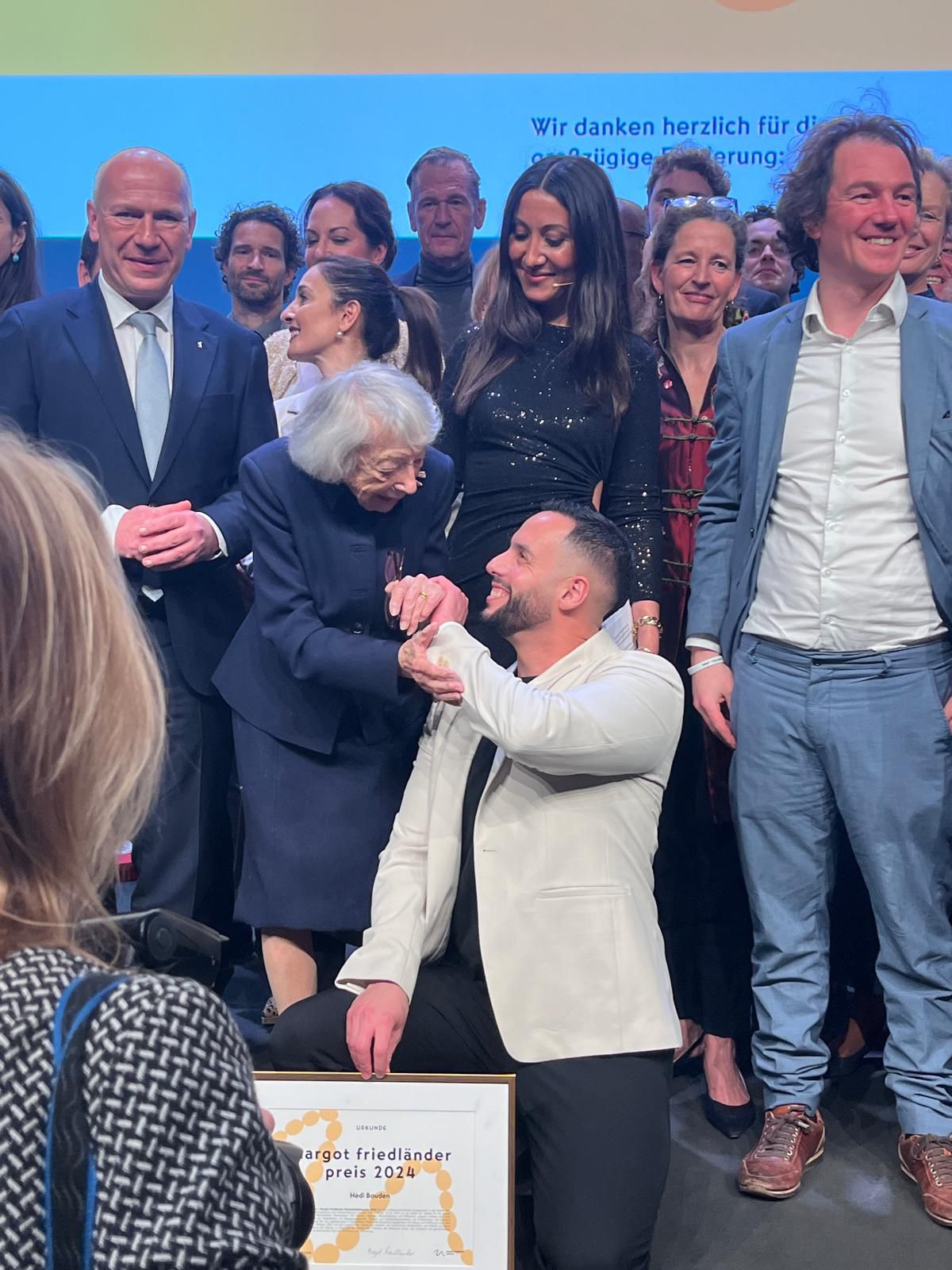 Hédi Bouden und Margot Friedländer (Mitte) bei der Verleihung des Margot Friedländer Preises 2024. Bouden wurde für sein außergewöhnliches Engagement in der Antisemitismusprävention ausgezeichnet Foto: ein