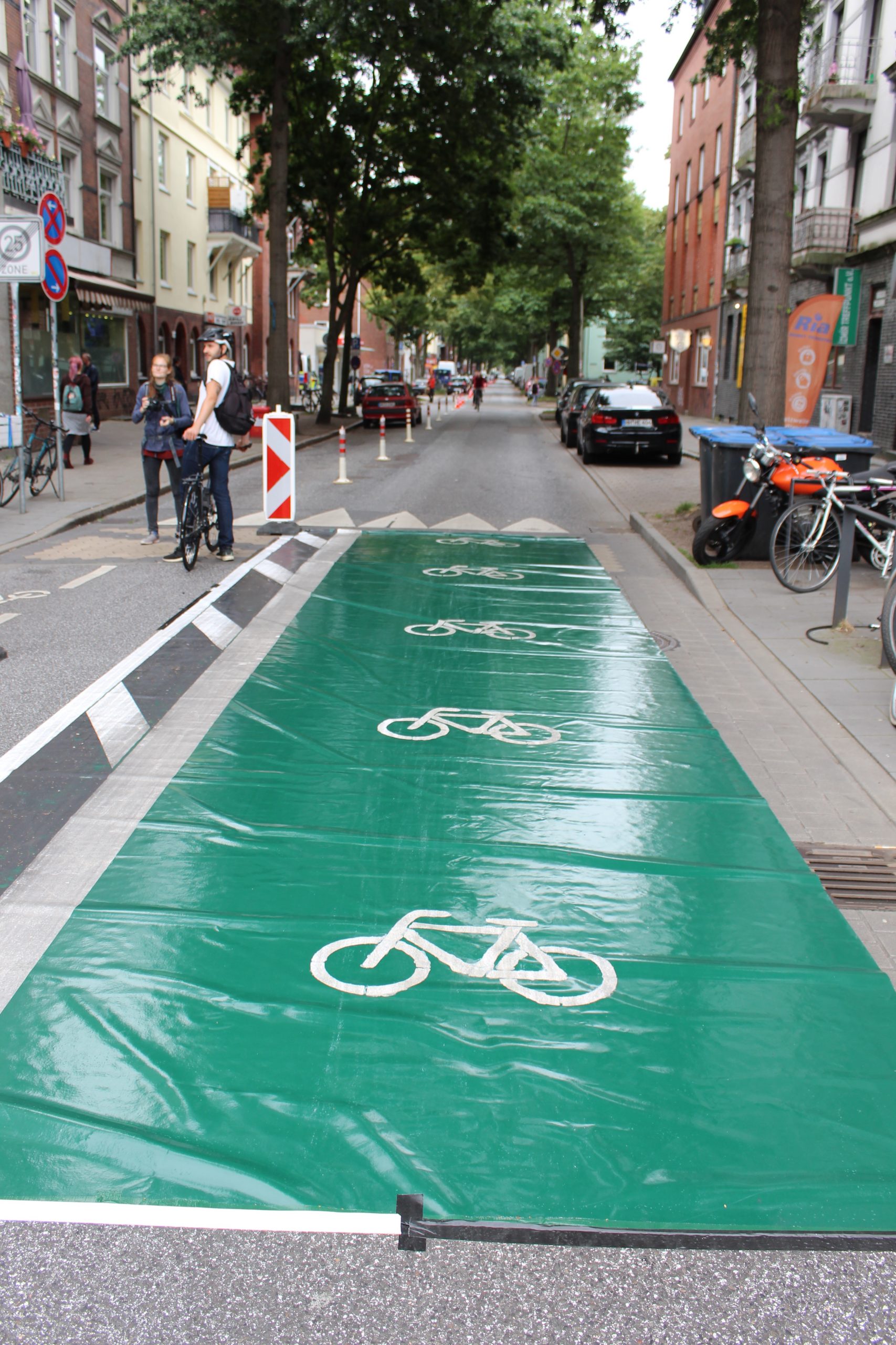 Im September vergangenen Jahres hatte die Initiative Autokorrektur Wilhelmsburg auf der Fährstraße Richtung Georg-Wilhelm-Straße einen PopUp-Radweg installiert um auf die Gefahren für Radfahrer in dieser Straße hinzuweisen Foto: au