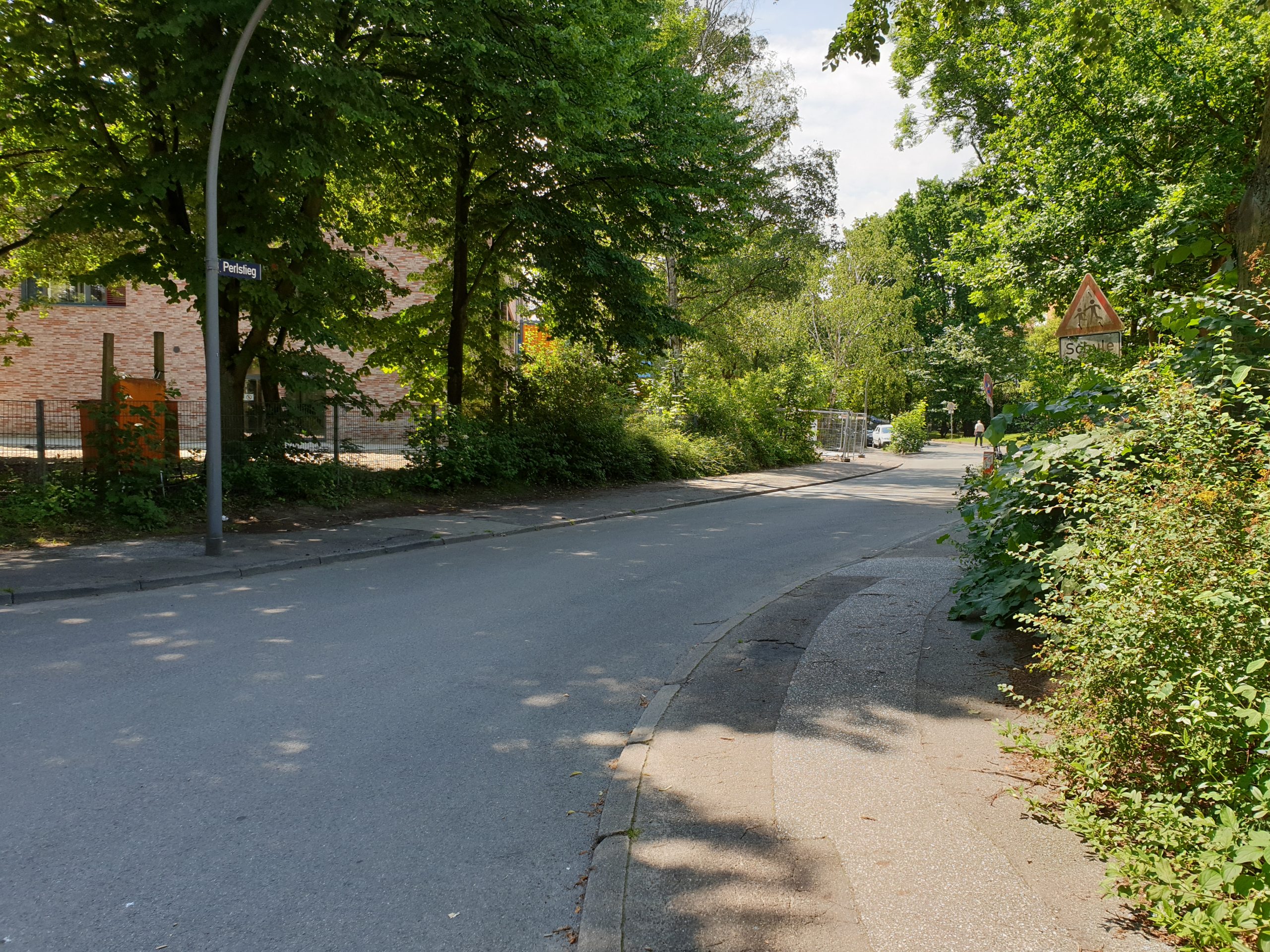 Idyllisch ist die Straße Perlstieg an der Stadtteilschule Wilhelmsburg. Zu Schulbeginn und -ende ändert sich das Bild aber. Gefährlich wird es dann durch Eltern die ihre Kinder zur Schule bringen oder abholen. Foto: au