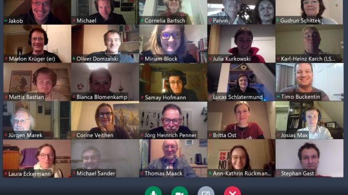 Ursprünglich sollte bereits im Oktober eine analoge Mitgliederversammlung im Rieckhof die neue Führung wählen; dies musste wegen der wieder steigenden Infektionen jedoch kurzfristig abgesagt werden. Am 30. November „trafen“ sich dann etwas über 40 der 170 Mitglieder zu einer virtuellen Versammlung (siehe Screenshot) und bestimmten die Kandidaten für die einzelnen Posten. Über diese Wahlvorschläge konnten danach alle Mitglieder per Briefwahl endgültig abstimmen. Die Beteiligung an dieser Briefwahl hat die alte und neue Vorstandssprecherin Cornelia Bartsch überwältigt: „Es haben sich 90 Mitglieder beteiligt; das entspricht einer Wahlbeteiligung von 53 Prozent. Zum Vergleich: An einer analogen Mitgliederversammlung nehmen zu normalen Zeiten höchstens halb so viele Mitglieder teil; in Pandemiezeiten wären es sicher nochmal weniger gewesen. Wir haben also – bei allem Bedauern über die fehlende Möglichkeit der persönlichen Begegnung – deutlich mehr Mitglieder erreicht als früher.“