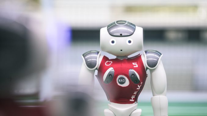 Foto: TU Hamburg. -Die 50 Zentimeter kleinen Roboter-Kicker der HULKs können dank ihrer Programmierung wie ihre menschlichen Vorbilder auf dem Spielfeld agieren