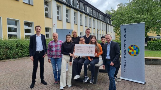 Mit einem Gewicht von rund 750 Kilogramm pro Stück sind die neuen Spielgeräte auf dem Pausenhof der Nelson-Mandela-Schule nicht nur sehr robust, sondern auch definitiv diebstahlsicher: Seit Anfang des Jahres stehen zwei neue Tischtennisplatten aus Beton vor dem Haupteingang der Schule. Damit erweitert die Schule ihr Pausenangebot für die Schüler, die die Platten auch gleich für sich eingenommen haben. „Die Platten wurden sehr gut angenommen. Und die Schüler finden ihr eigenes Spiel damit“, erklärt Harri Schümann, Beauftragter für Fundraising. Nun können sich die Schüler in den Pausen an den Platten richtig auspowern. Das man dazu nicht unbedingt Tischtennisschläger und kleine, weiße Kunststoffbälle braucht, zeigt ein Blick in eine Pausenzeit: Geschickt spielen die Jungen und Mädchen einen Fußball über das Netz, laufen um die Platte herum, spielen den Ball wieder rüber.