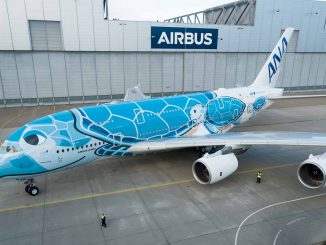 Erste A380 für ANA verlässt Lackierhangar. Bemalung mit grünen Meeresschildkröten. Airbus hat die erste A380 für All Nippon Airways (ANA) (bittte weiter lesen)