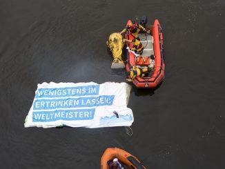 „Wenigstens im Ertrinkenlassen Weltmeister“ Sea-Watch-Protest in Harburg Mit einem schwimmenden, überdimensionalen WM-Pokal sowie einem Banner mit der Aufschrift „Wenigstens im (bittte weiter lesen)
