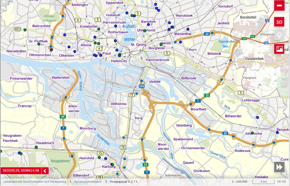 Ein Blick auf die Übersichtskarte der Sozialbehörde (Stand 11. März 2021 17 Uhr) zeigt dass es auf den Elbinseln keinen Standort für Schnelltestungen gibt Screenshot: au