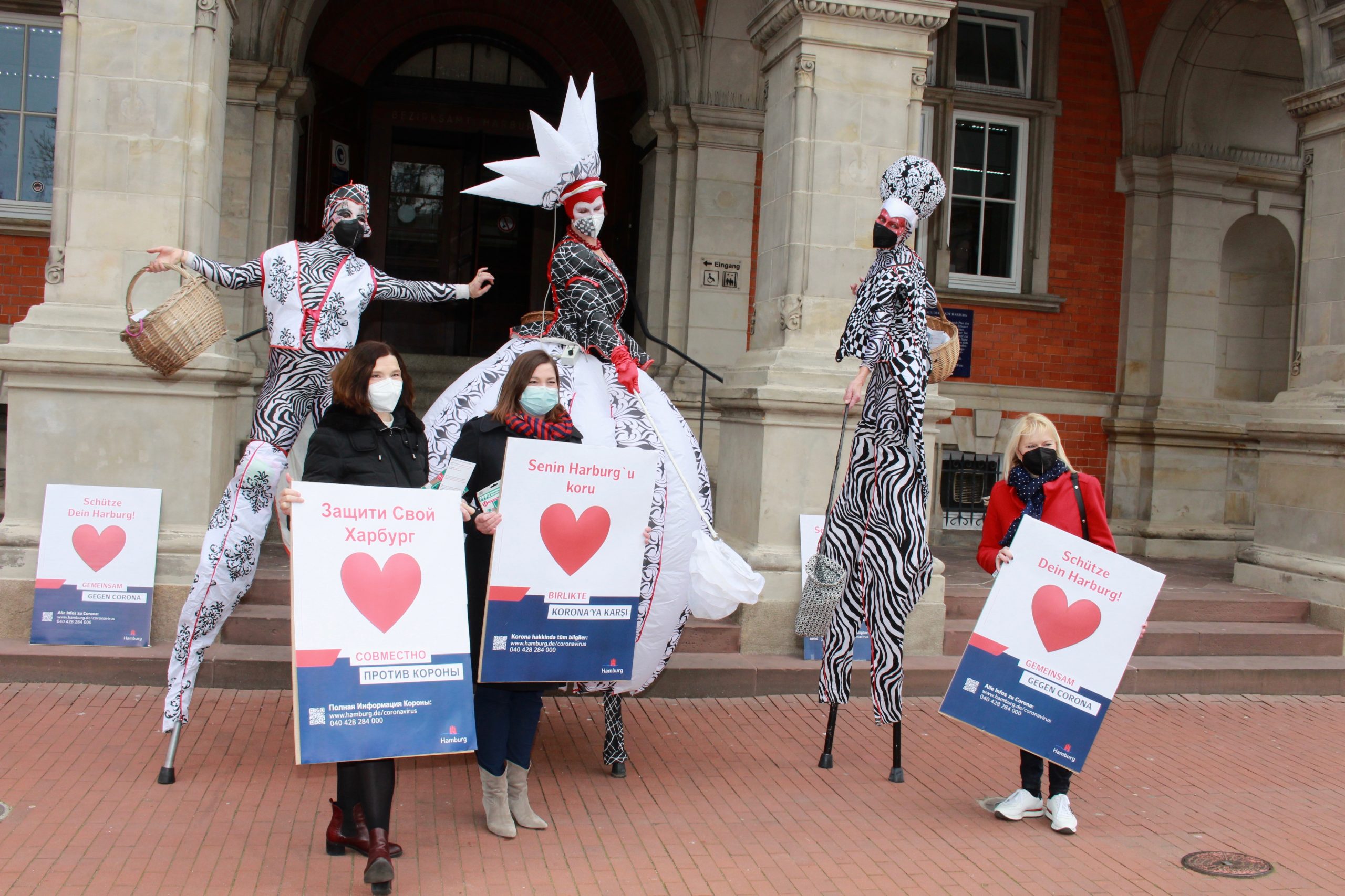 Zum Aktionstag waren Stelzenläufer in der Fußgängerzone und auf öffentlichen Plätzen Harburgs unterwegs, die mit gebotenem Abstand über Schutzmaßnahmen informierten und gratis Masken verteilten. Auch der Corona-Schnelltestbus ist vor Ort.