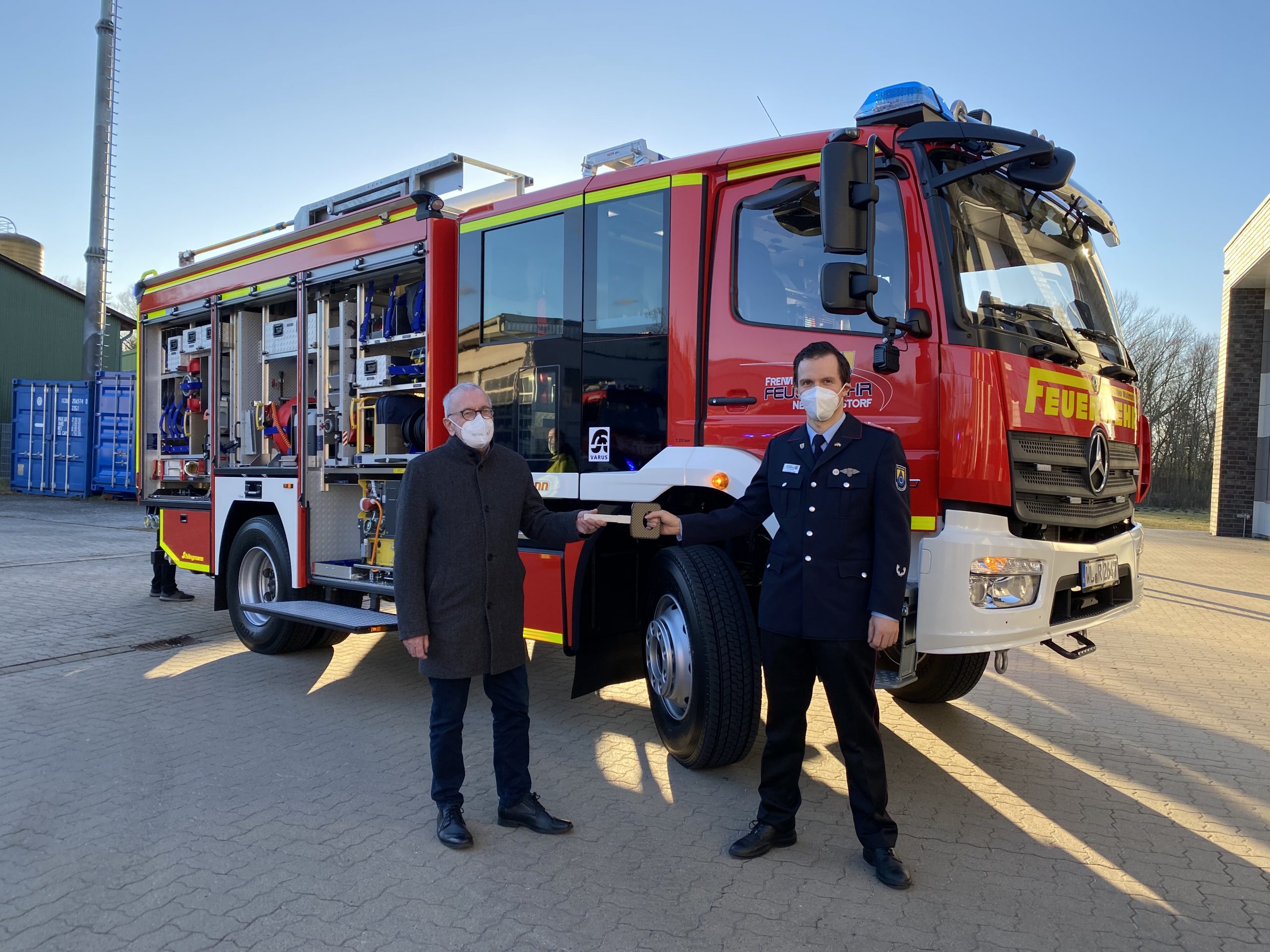 Finn Griehl -Bürgermeister Wolft Rosenzweig (l.) und der Ortsbrandmeister der Feuerwehr Neu Wulmstorf Lars-Lennart Egge nahmen das neue Löschfahrzeug in Empfang