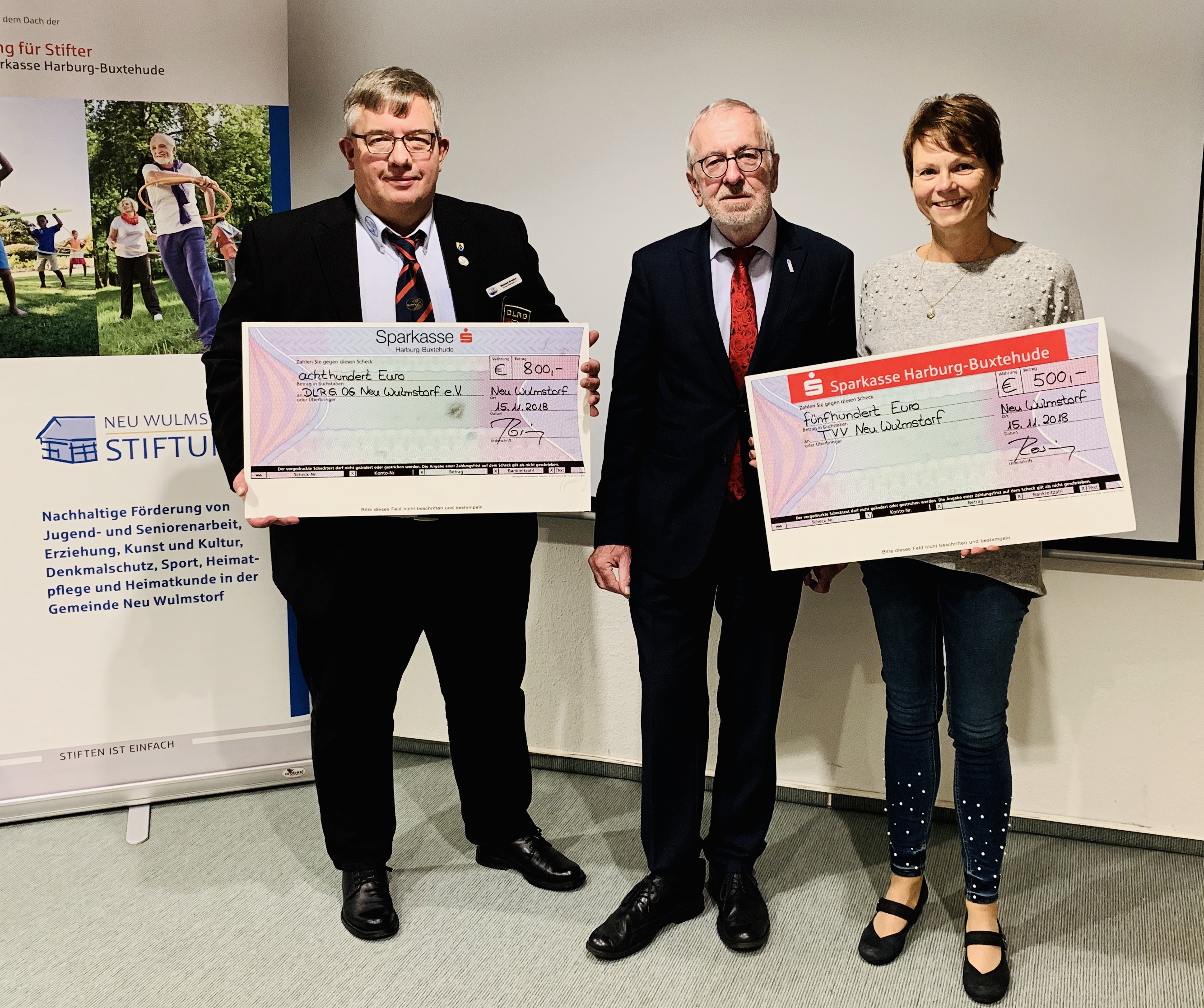 Neu Wulmstorf-Stiftung -Bürgermeister Wolf Rosenzweig (m.) mit den diesjährigen Gewinnern des Förderpreises der Neu Wulmstorf-Stiftung: Michael Bredow DLRG Neu Wulmstorf und Britta Martens TVV Neu Wulmstorf.