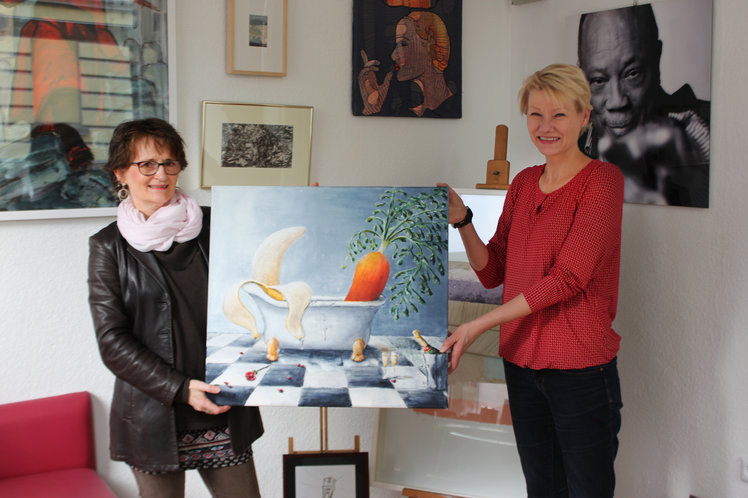 Kunstleihe Harburg -Sabine Schnell (re.) nimmt das Bild aus den Händen von Yvonne Lautenschläger entgegen Kunstleihe Harburg -Sabine Schnell (re.) nimmt das Bild aus den Händen von Yvonne Lautenschläger entgegen