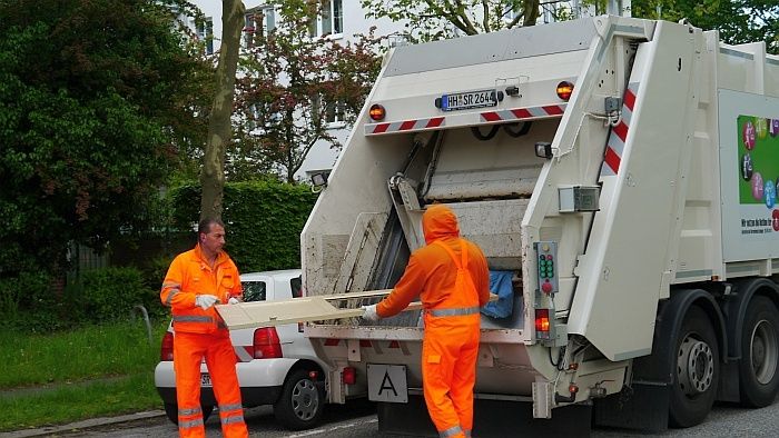 Stadtreinigung Hamburg -Sperrmüllabfuhr der Stadtreinigung: Die Mitarbeiter tragen orangefarbene Kleidung die Fahrzeuge sind weiß