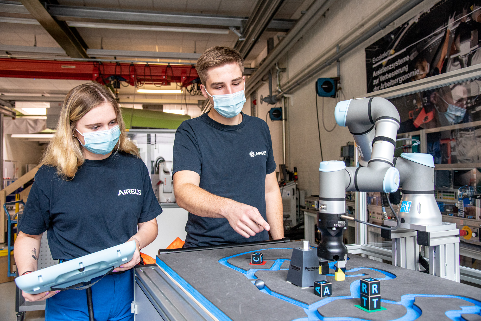 airbus -Airbus-Auszubildende machen sich im Trainingszentrum am Standort Hamburg mit den Grundlagen der Robotik vertraut. airbus -Airbus-Auszubildende machen sich im Trainingszentrum am Standort Hamburg mit den Grundlagen der Robotik vertraut.