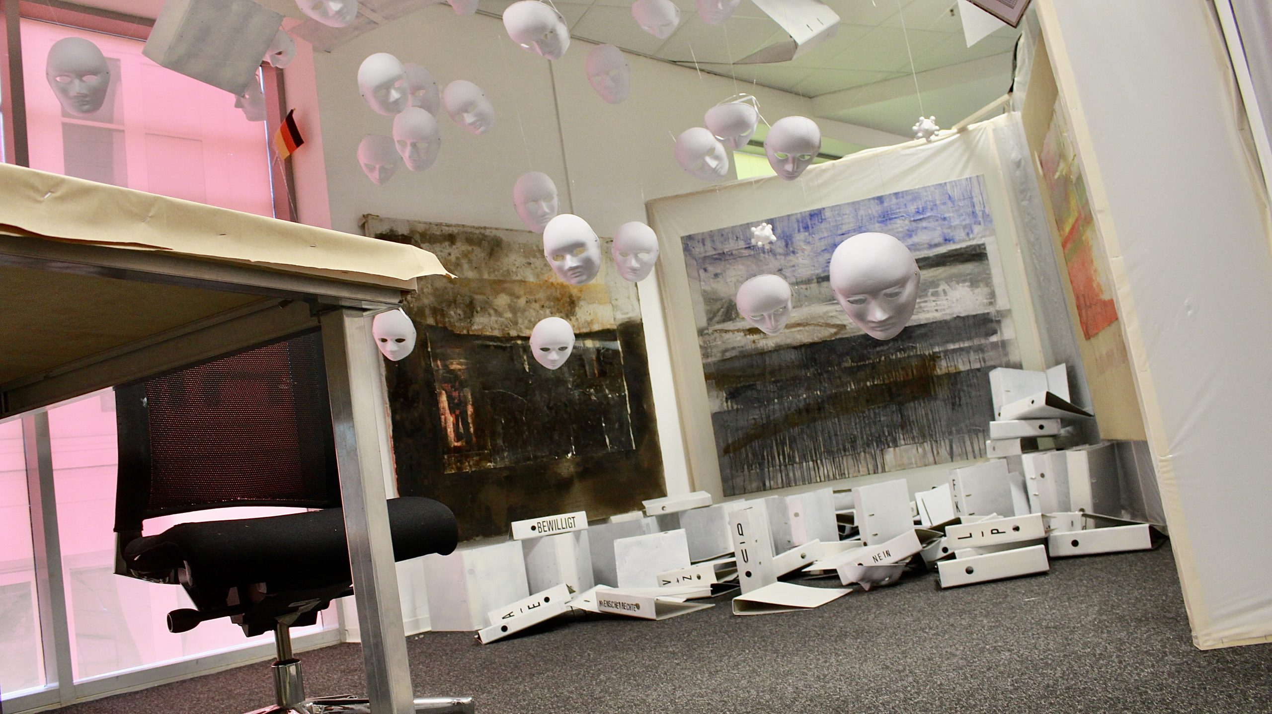 Sehenswert und originell auch ein mit dunkler Folie ausgelegtes Labyrinth – die schwarze Farbe soll Gefahr suggerieren -, dessen Wände mit Bildern von Personen auf ihren Fluchtwegen dekoriert sind. Was auffällt: Die meisten Personen auf diesen Bildern lachen, doch es ist ein unnatürliches, gestelltes Lachen, das die achtzehnjährige Fotografin auf dem Fluchweg eingefangen hat. Schließlich die Ankunft in Deutschland. Weiße, blasse Masken hängen an dünnen Fäden von der Decke, schauen sich orientierungslos im Raum um und entdecken einen leeren Stuhl und jede Menge ebenso weiße Aktenordner, auf deren Rücken „Asyl“ bzw. ein großes schwarzes Ja oder Nein zu lesen ist – szichwort: Behördenirrsinn! Damit ist die Ausstellung eine spannende Reise die den Betrachter mit turbulenten und tragischen Ereignissen konfrontiert.