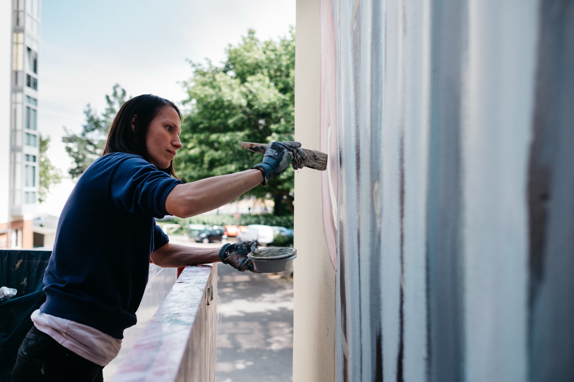 Copyright: Kathrine Uldbæk Nielsen -Die Künstlerin Jana vom internationalen Künstler-Duo Jana & JS bei der Arbeit an dem großen Wandbild in Harburg (Amalienstraße)