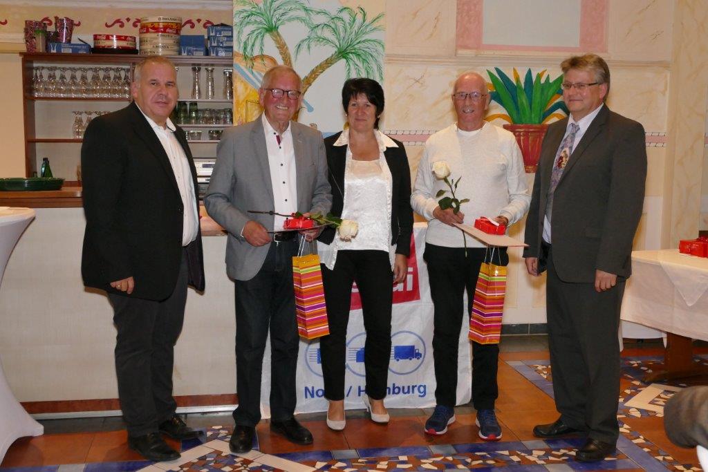 priv. -Das Foto zeigt die beiden verdi-Mitglieder die 65-jährige Jubiläen feierten (v.l.): Lars-Uwe Rieck Landesfachbereichsleiter Jubilar Gerhard (Pit) Fluder Elke Hartwig Kassiererin der Betriebsgruppe Jubilar Heinz Peter und Peter Jagusch Betriebsgruppenvorsitzender.