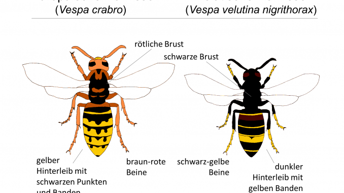 Von der Europäischen Hornisse unterscheidet sich die asiatische Verwandte vor allem durch die fast vollständig schwarze Färbung bis auf einen gelben Streifen am Hinterleib und die sehr scharf abgegrenzten gelben Beine. Auch ist die Asiatische Hornisse die einzige in Hamburg vorkommende Hornissen-Art, die hoch oben in Bäumen völlig freihängende Nester baut. Die Asiatische Hornisse ist nicht zu verwechseln mit der Asiatischen Riesen-Hornisse (Vespa mandarinia), über die vielfach im Zusammenhang mit tödlichen Stichen in Asien berichtet wird. Die Riesenhornisse kommt in Europa nicht vor!