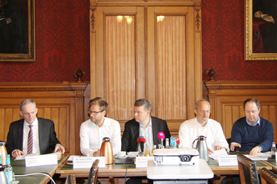 Anselm Sprandel (Zentrale Koordinierungsstab für Flüchtlinge), Anjes Tjarks (Grüne), Andreas Dressel (SPD), Klaus Schomacker ( Volksinitiative „Hamburg für gute Integration“ ) und Sven Blum (Bürgerinitiative Neugraben-Fischbek – souverän in Süderelbe) stellten den Orientierungs- und Verteilungsschlüssel (OVS) vor.Foto: Jan Greve