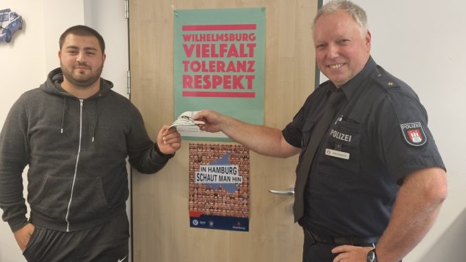 „Das geht so nicht“, schoss es Cihat Degermenci durch den Kopf. „Ich habe es selber öfter erlebt, das mein Auto aufgebrochen wurde und keiner hat da eingegriffen“, erinnert er sich. Diesmal sollte der Dieb nicht davonkommen! Also stellte sich der Vater einer kleinen Tochter dem Dieb in den Weg. Überrascht von dem Vorgehen ließ der Kriminelle, der zudem auch leicht angetrunken war, das Fahrrad und das Diebesgut stehen und wollte zu Fuß flüchten. Doch da hatte er die Rechnung ohne Cihat Degermenci gemacht. „Ich habe mich ihm in den Weg gestellt und nach einem kurzen Handgemenge solange festgehalten, bis die Polizei eingetroffen ist. Die hatte in der Zwischenzeit meine Frau angerufen“, so Degermenci. In so einer aufregenden Situation ruhig zu bleiben und so besonnen zu reagieren, hat der 23-Jährige beim Boxen gelernt. „Sie haben hervorragend reagiert, der Täter wäre sonst weg gewesen. Wir konnten mittlerweile das Diebesgut an den Besitzer zurückgeben. Und der Täter war geständig“, erzählt Karl-Michael Strohmann, Leiter des Polizeikommissariats 44 in Wilhelmsburg. Aufgrund seiner außerordentlichen Zivilcourage hatten Strohmann und Stabsleiterin Gabriele Schröder den Wilhelmsburger auf das Polizeikommissariat 44 eingeladen und ihm für sein beherztes Eingreifen gedankt. Als Dankeschön für seine Aktion erhielt Cihat Degermenci zu seiner Überraschung noch zwei Kinokarten. Aber der Kommissariatsleiter wies auch noch mal daraufhin, dass man bei solchen Vorgehensweisen äußerste Vorsicht walten lassen müsse, denn Eigensicherung gehe in jedem Fall vor. Deswegen solle man immer zuerst die Polizei anrufen!