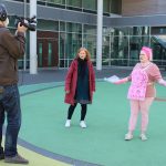 „Kannst Du vielleicht ‚Öff Öff‘ öfter mit einbauen?“, fragt Theaterregisseurin Christiane Richers Lehrerin Jenny Misfeld alias das Hausschwein Wutz. Zusammen mit Kameramann Andreas Schwarz, Marcel Weinand (Kostüme) und Theaterpädagogin Gesche Groth drehen die beiden gerade eine kleine Filmszene.