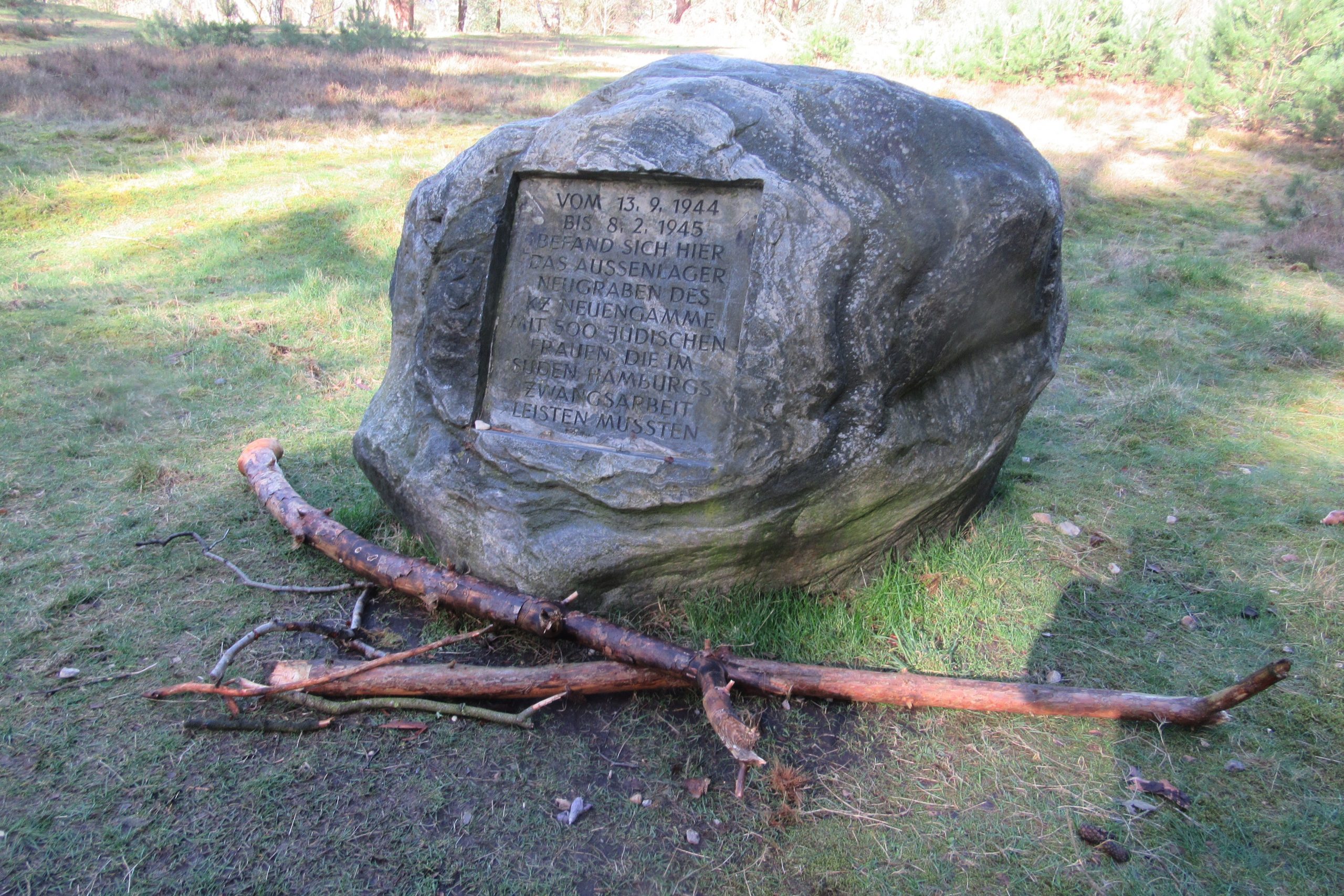 Bildunterschrift: Am ehemaligen Standort des KZ-Außenlager am Falkenbergsweg weist heute ein Gedenkstein auf die Leiden der rund 500 jüdischen Insassinnen hin