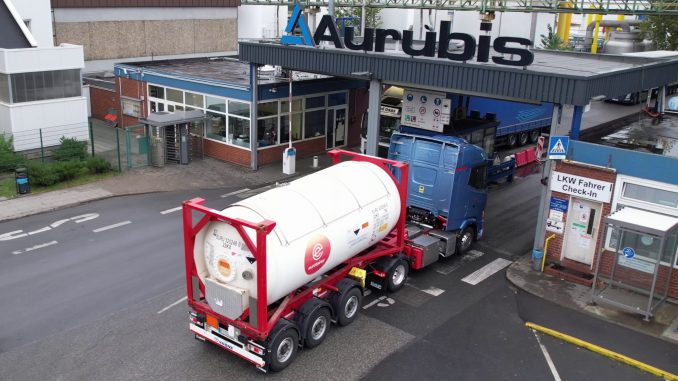 Die für die Testreihe benötigten 13 Tonnen Ammoniak wurden von der Abu Dhabi National Oil Company (ADNOC) aus den Vereinigten Arabischen Emiraten geliefert und am Terminal Altenwerder von der Hamburger Hafen und Logistik AG (HHLA) umgeschlagen Foto: Aurubis