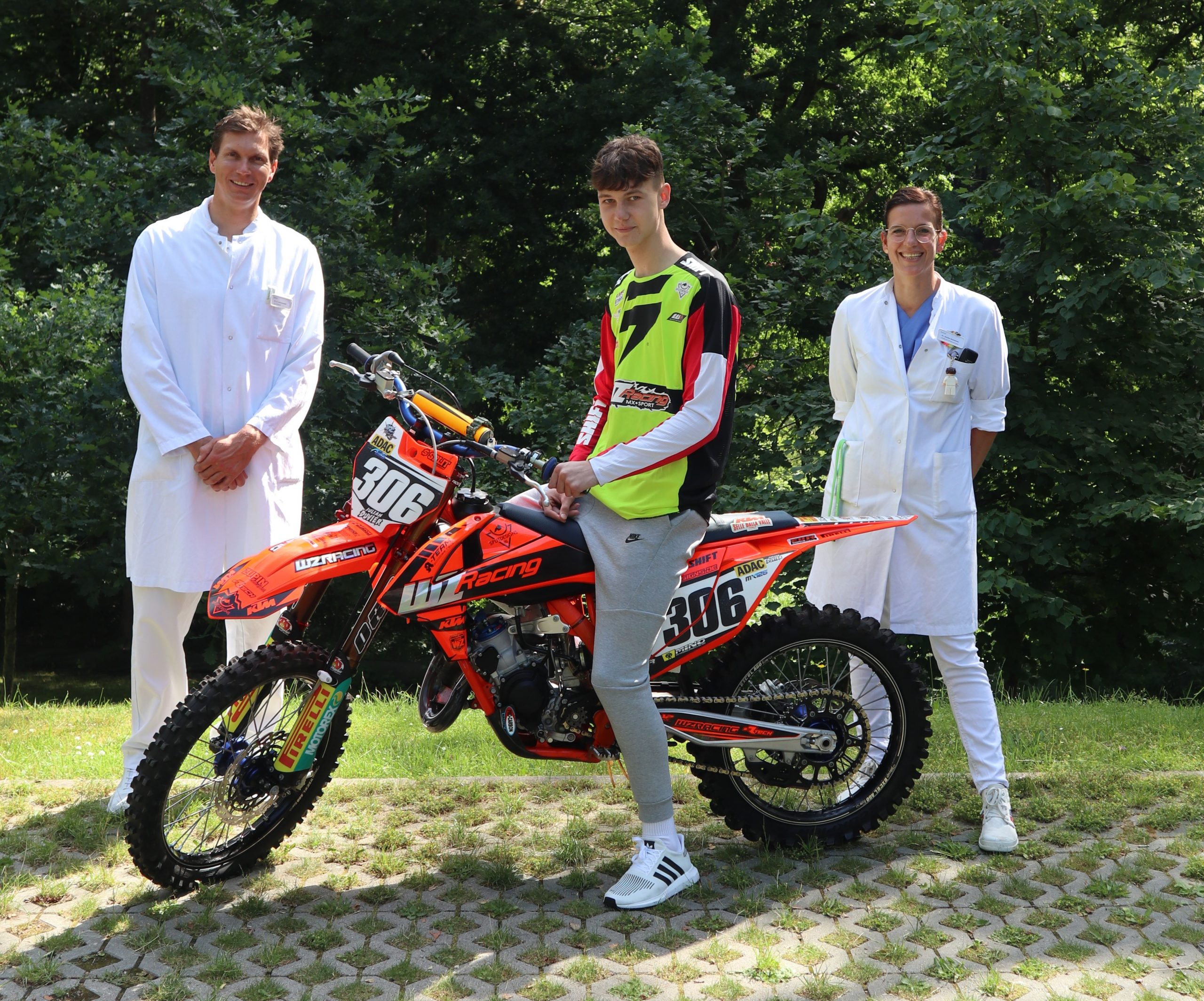 helios -Julian Duvier professioneller Motorcross-Sportler fühlt sich bei seinen behandelnden Ärzten der Helios Mariahilf Klinik Hamburg sehr gut aufgehoben (v.l.): Dr. med. Henning Jeziorkowski Leitender Oberarzt der Unfallchirurgie und orthopädischen Chirurgie; Julian Duvier professioneller Motorcross-Sportler; Dr. med. Annika Steinbrink Chefärztin Kinderchirurgie