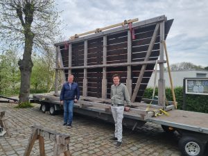Carsten Schmidt 1. Vorsitzender des Wilhelmsburger Mühlenvereins (links) und Müller Julian Hecht vor den vorgefertigten Teilen der neuen Mühlengalerie Fotos: au