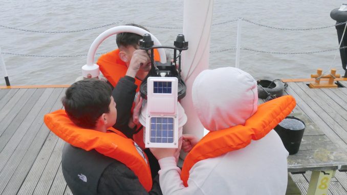 Zwei Schülerinnen und sieben Schüler der Profilklasse „Technik“ der Stadtteilschule Wilhelmsburg machen sich mit ihrem Anleiter Fabian Brecht auf dem Ponton sofort an die Arbeit. Die von der Wetterstation erfassten Klimadaten wie Temperatur, Niederschlagsmenge, Luftdruck, Luftfeuchtigkeit, Windrichtung und -geschwindigkeit der letzten Woche wollen abgelesen, protokolliert und ausgewertet werden. Diese Werte werden mit den Ergebnissen anderer Messstationen von Hamburger Schulen verglichen. Das Thema Klimawandel schwingt dabei immer mit.