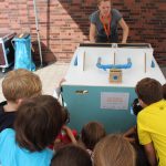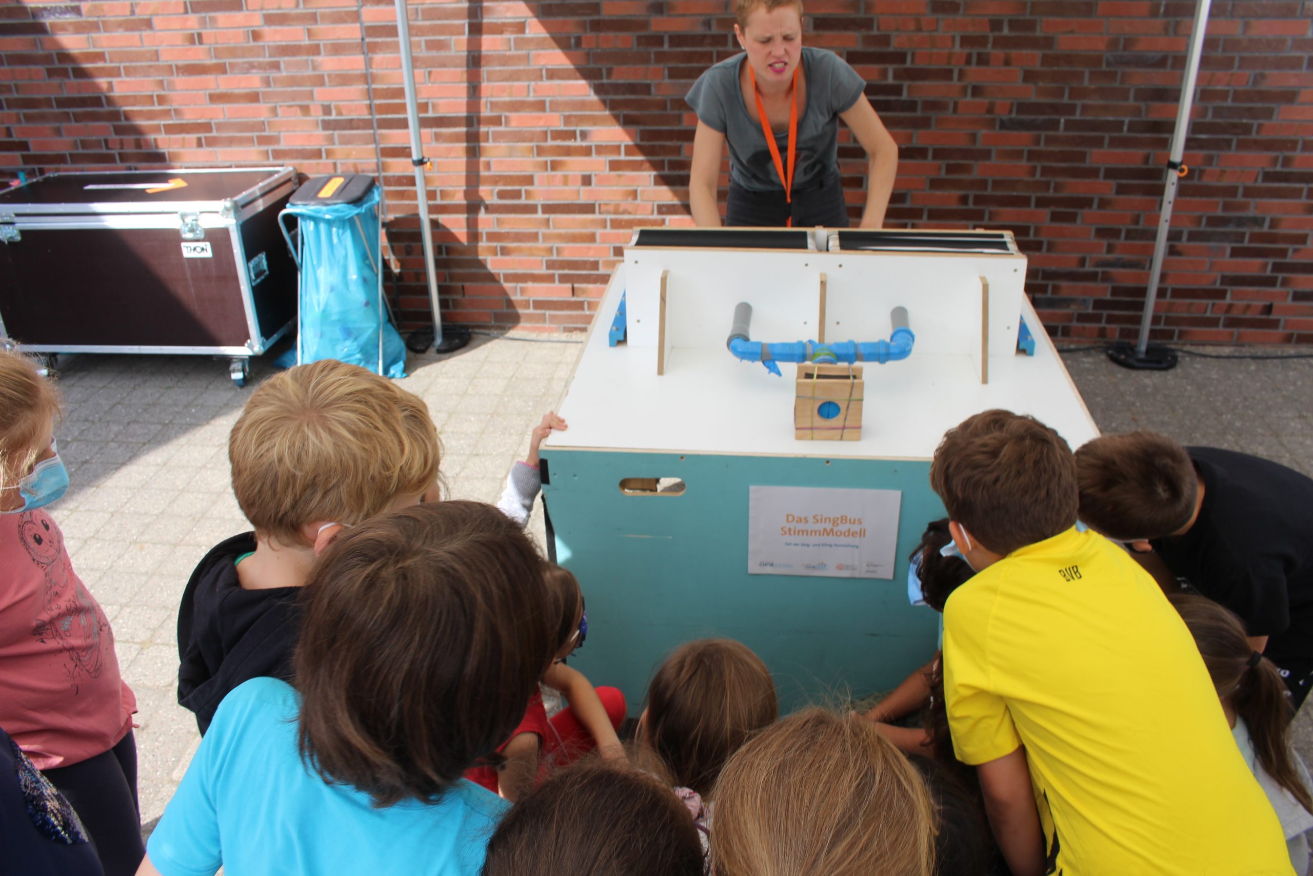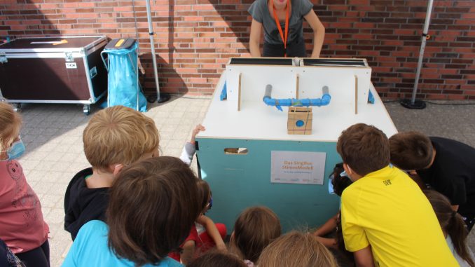 Hannah Ewald hatte einen Kehlkopf mitgebracht. Ihren eigenen natürlich, aber auch einen selbst gebastelten: eine quadratische Holzbox (etwa 20 x 20 x 20 cm) mit einer aufgeschlitzten Plastikmembrane, das Ganze verbunden durch zwei blaue handelsübliche Kunststoffrohre aus dem Baumarkt mit einem Blasebalg, ähnlich wie bei einem Akkordeon. Damit führte die Kinderchorleiterin und Liederschreiberin vor, wie Töne rein mechanisch in der Kehle entstehen, natürlich versehen mit der Ergänzung, dass erst die Aktivierung von Muskeln und Sehnen aus diesen Lauten wohlklingende Töne entstehen lassen. So geschehen am Schulhof der Eißendorfer Grundschule In der Alten Forst. Dort hatte am Dienstag im Rahmen der bundesweiten Tour auf Betreiben von Susann Lahesalu, deren ältestes Kind diese Schule besucht, der Chor-Truck der Deutschen Chorjugend Station gemacht. Ihr Anliegen: Die Gründung eines Jungen-Chors an dieser Schule. Da kam die Tour des Chor-Trucks gerade recht. Er machte eine Ausnahme, denn eigentlich steuert er in der Regel kleine Ortschaften und Schulen an, wo das Singpotenzial kleiner ist als in Städten. Ihr Anliegen hatte Lahesalu dem Schulleiter Andreas Wiedemann vorgetragen, und der sagte sich „Warum eigentlich nicht?“ Er stufte das Unterfangen zwar als schwierig ein, einen Versuch sei es aber allemal wert, befand er, zumal Corona und Singen in den letzten beiden Jahren kaum zusammen passten. „Doch nun hat die Deutsche Chorjugend ein Hygienekonzept entwickelt, das genau dies wieder ermöglicht: Fröhlichen Gesang von Kindern“, freute sich Wiedemann. An drei Stationen des Chor-Trucks, begleitet von drei Musikpädagogen, wurden die Schülergruppen aus den Klassen 2-4 mit der Welt der Töne und des Singens vertraut gemacht.