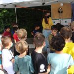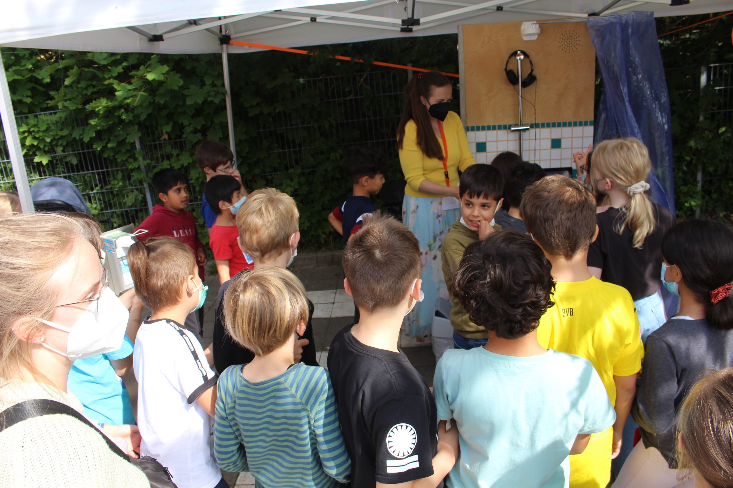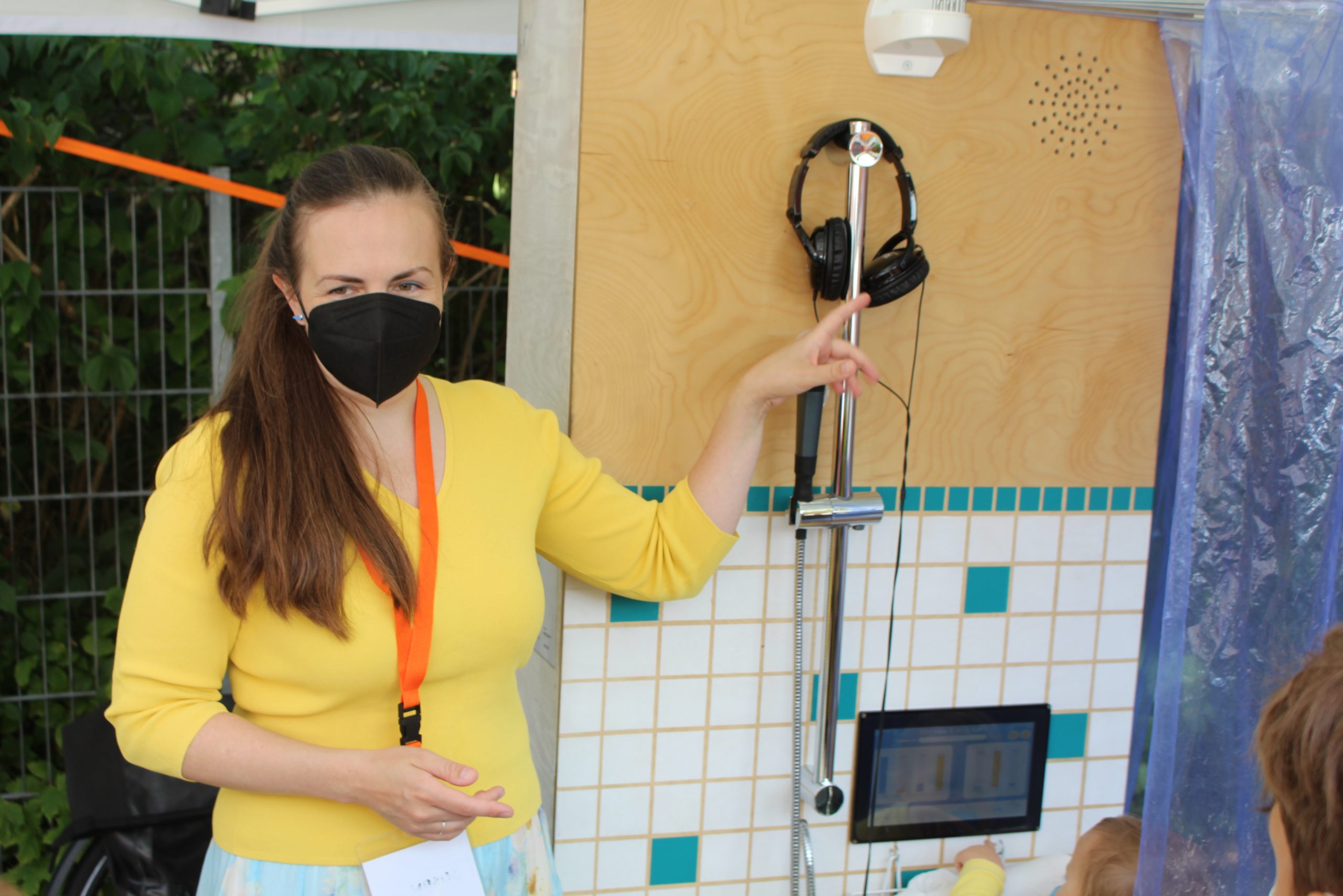 „Wir als Schule unterstützen diese schöne Idee, weil sie ein weiterer Baustein eines umfassenden Bildungsangebots ist“, so der Schulleiter. Eine Rhythmus-Station ist ebenso Teil dieses Projektes, ebenso wie eine Singdusche, denn bekannterweise singen ganz viele Menschen oft und gerne unter der Dusche, nur dass aus der Dusche am Schulhof kein Wasser perlte, sondern wohlklingende Töne, zu denen die Kinder – ein Touch von Karaoke – singen konnten, verbunden mit der Hoffnung der Erwachsenen, dass sie Spaß am Singen finden. Zum Abschluss enterten die Kinder coronagerecht die Bühne, um ein erstes gemeinsames Lied anzustimmen. Jeweils am Freitag beabsichtigt Susann Lahesalu dann ein Schnupperangebot bereit zu halten, verbunden mit der Hoffnung, dass daraus das von ihr angestrebte, spannende Chorprojekt entsteht. „Wir fangen klein an“, sagte sie, wie es in der Nachwuchsarbeit oftmals üblich sei, strahlte aber vor Optimismus. Das Programm des Chor-Trucks will dazu beitragen, diese Vision in die Tat umsetzen.