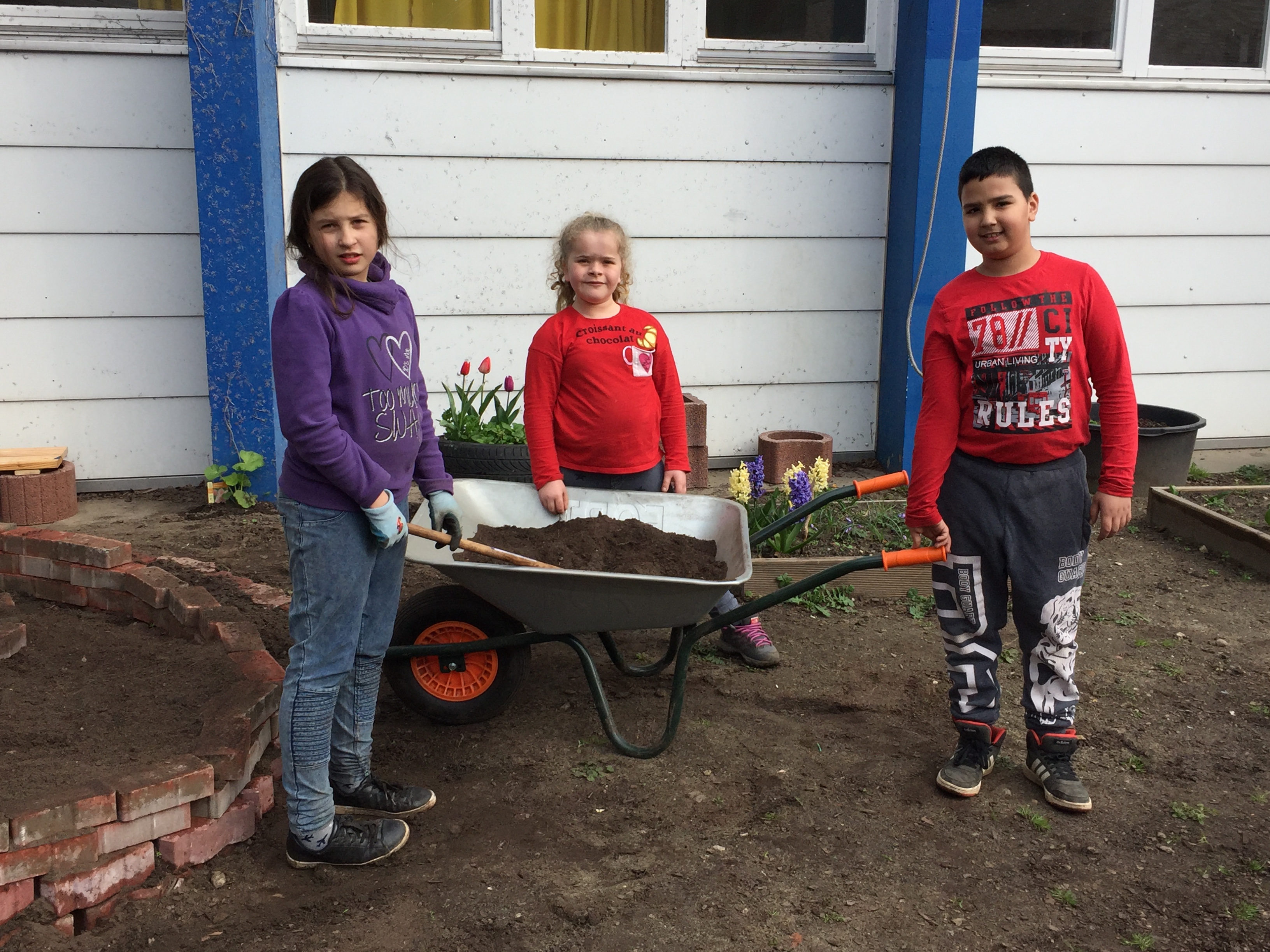 Selma Ziberi Rroona Idrizi Harun Ergün bringen die Muttererde zur Kräuterspirale. Foto: ein Selma Ziberi Rroona Idrizi Harun Ergün bringen die Muttererde zur Kräuterspirale. Foto: ein