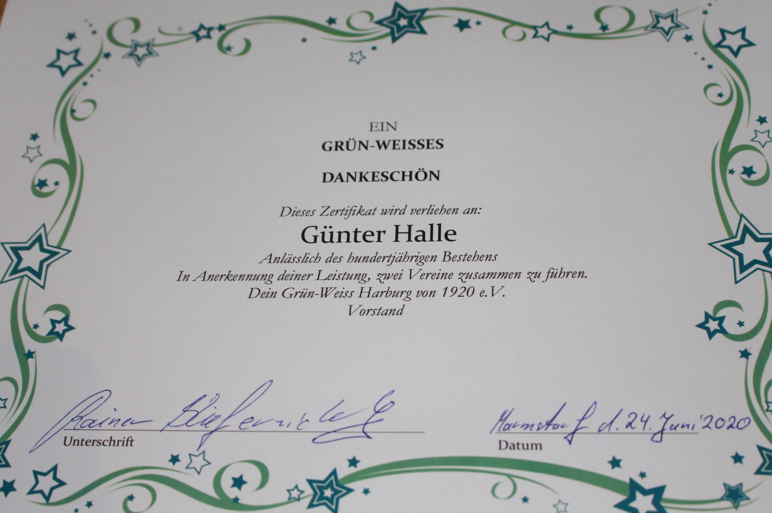 „Ihr seid ein leuchtendes Beispiel für den Einsatz eurer Freizeit“, fuhr Bliefernicht fort und überreichte den beiden ihr Ehren-Zertifikat „anlässlich des hunderjährigen Bestehens“ (denn der VfL war schon 1920 gegründet worden) und in Anerkennung der Leistung, zwei Vereine zusammengeführt zu haben. „Für diese gemeinnützige und somit auch gesellschaftlich wichtige Aufgabe zur Erhaltung der Gesundheit der Harburger Bevölkerung durch den Sport ein herzliches Dankeschön.“ Halle, gesundheitlich etwas angeschlagen, kam an diesem Tag nur langsam in Fahrt, ließ aber dann seinen Erinnerungen freien Lauf um dann festzustellen: „Grün Weiss ist ein Vorzeigeverein geworden.“ Und Karl-Heinz Aue betonte ausdrücklich: „Die Gründung von Grün-Weiss war das Lebenswerk von Günter Halle.“