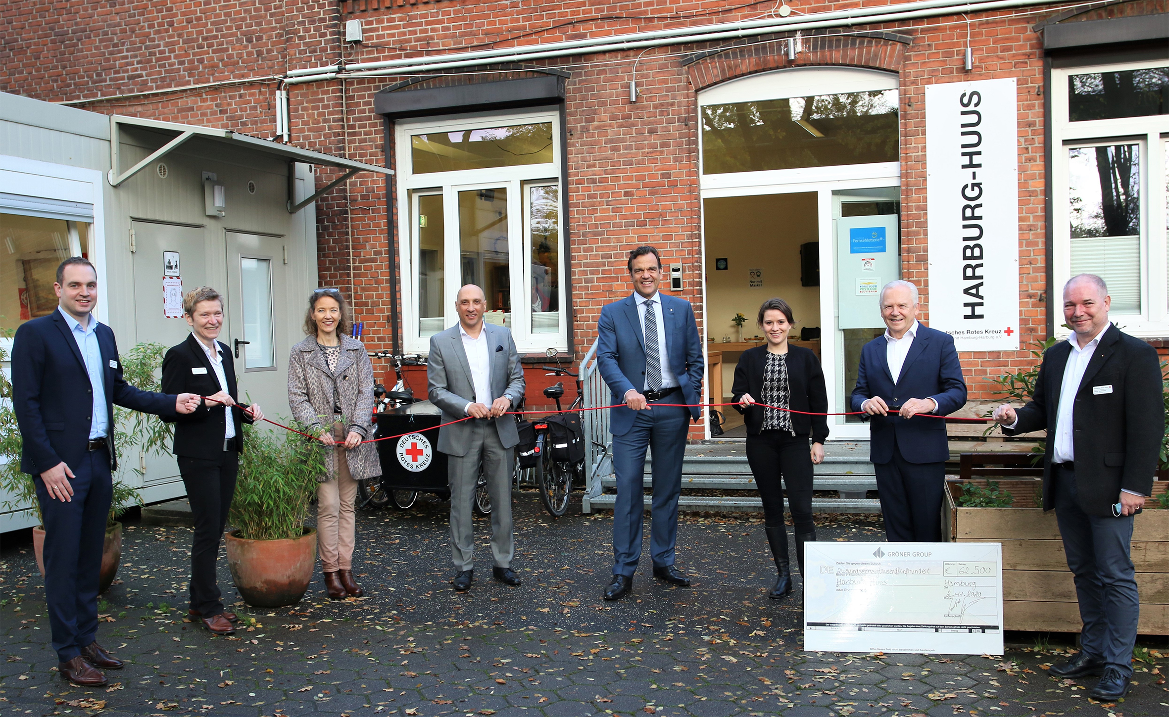 Foto: DRK-Kreisverband Hamburg-Harburg -Miteinander verbunden um obdachlose Menschen zu unterstützen (v.l.): Thorben Goebel-Hansen (Einrichtungsleiter Harburg-Huus) Dr. Simone Thiede (DRK-Fundraiserin) Karin Bischoff (stellv. DRK-Vorstand) Dr. Sam Foos (Gröner Group) Christoph Gröner (Geschäftsführer Gröner Group) Johanna Sprenger (Gröner Group) Prof. Dr. Rüdiger Grube (Schirmherr) Ulrich Bachmeier (DRK-Bereichsleiter)