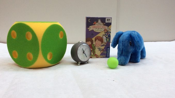 Würfel, Buch, Elefant, Ball, Wecker.